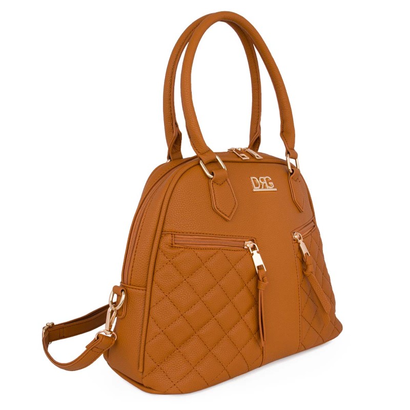 Women's camel shoulder bag. Made of eco-leather. It features 2 inner compartments, one with a zipper, and 3 outer compartments with zippers on the front and back. Adjustable, detachable crossbody strap. Dimensions: H 28cm, W 36cm, D 12cm. "Designed in Greece exclusively by De Raggi designers".